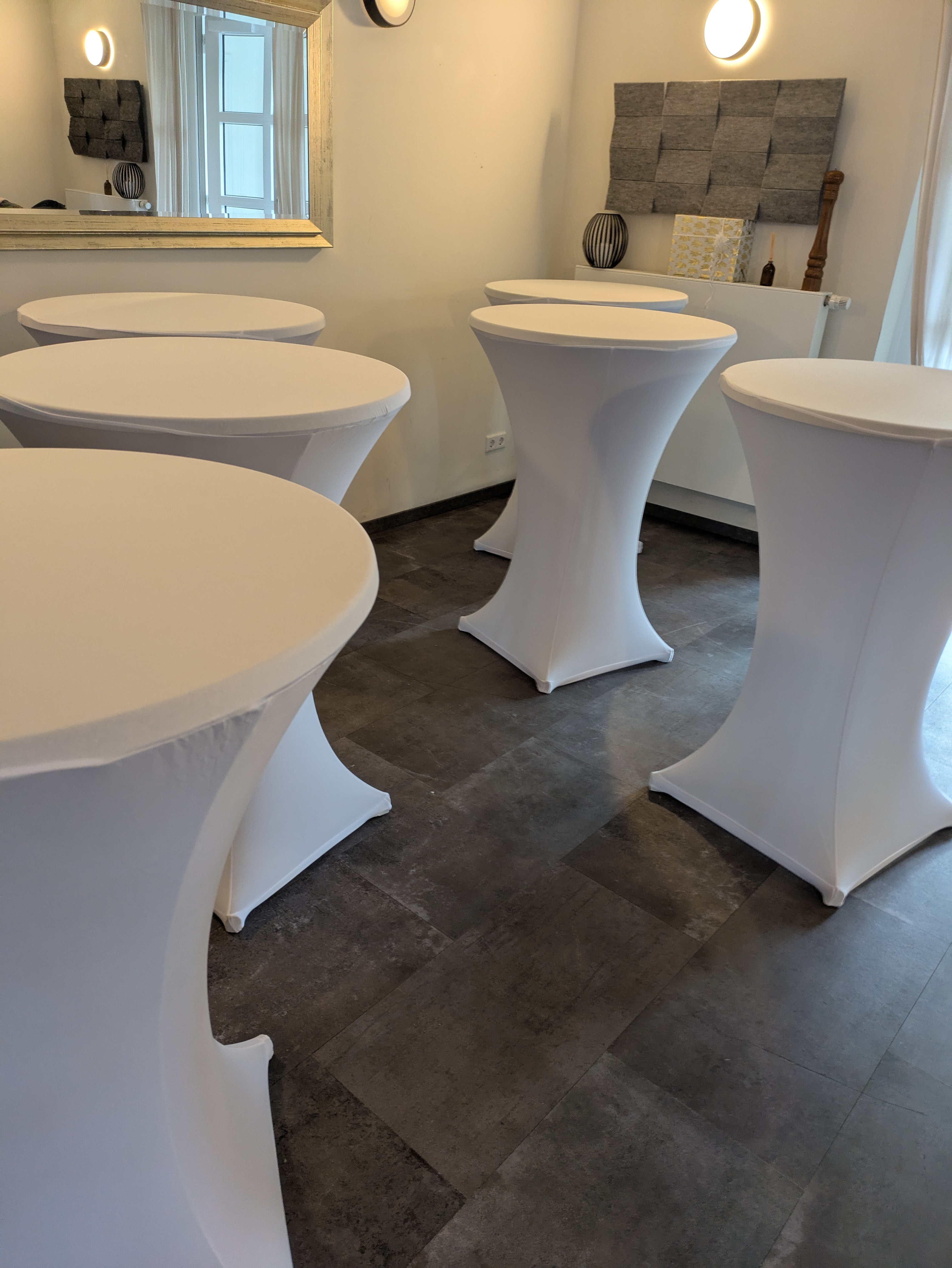 Zur weiteren Anpassung an Ihr Veranstaltungsthema können die Stehtische optional mit Hussen gemietet werden. Diese verleihen den Tischen eine elegantere Note und passen sich perfekt an das Ambiente Ihrer Veranstaltung an. Darüber hinaus empfehlen wir unsere Faltpavillons und gerne auch Kooperationspartner für weiteres Tisch- und Buffetzubehör, um Ihre Veranstaltung komplett zu machen.