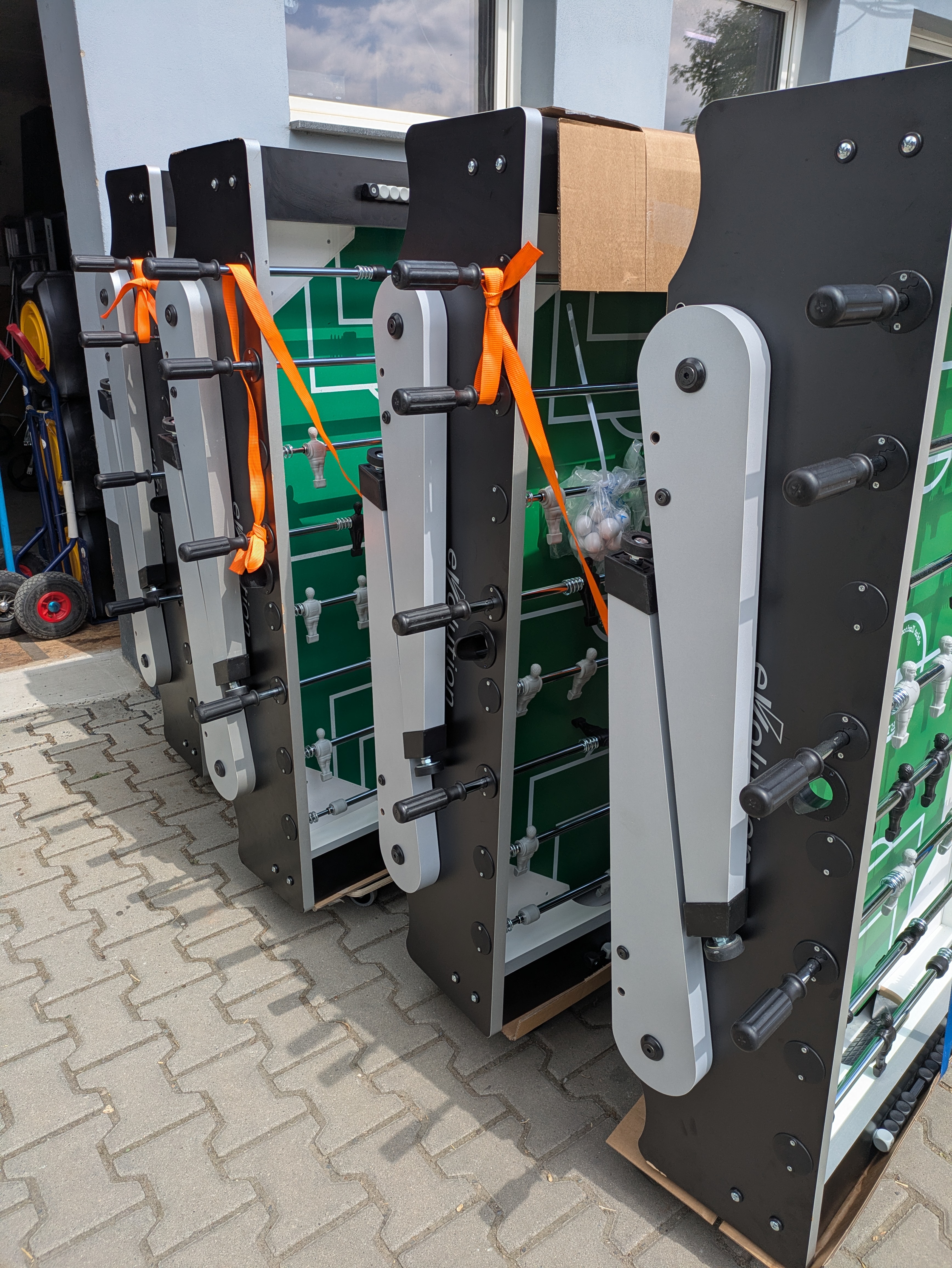 Die Anlieferung erfolgt auf einem Rollwagen. Die Zufahrt mit einem großen Transporter muss möglich sein. Bitte sogen Sie dafür, dass wir einen Parkplatz zur kurzzeitigen Nutzung zur Verfügung haben. Eine ebenerdige Anlieferung ohne Treppen ist in den Lieferkosten inklusive. Ebenso der Auf und Abbau der Eventmodule. Den Tisch liefern wir hochkant stehend zu Ihrem Public Viewing Event. Die Beine klappen wir während des Transportes ein. Der Tischkicker Profi passt also in normale Aufzüge und durch normale Türen.